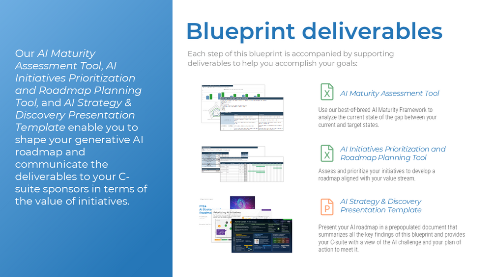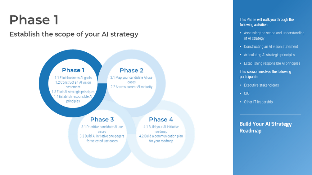 With the AI Strategy Roadmap Blueprint, you’ll gain a proven framework to develop an AI vision, assess AI maturity, prioritize initiatives, and create a clear roadmap for AI success.